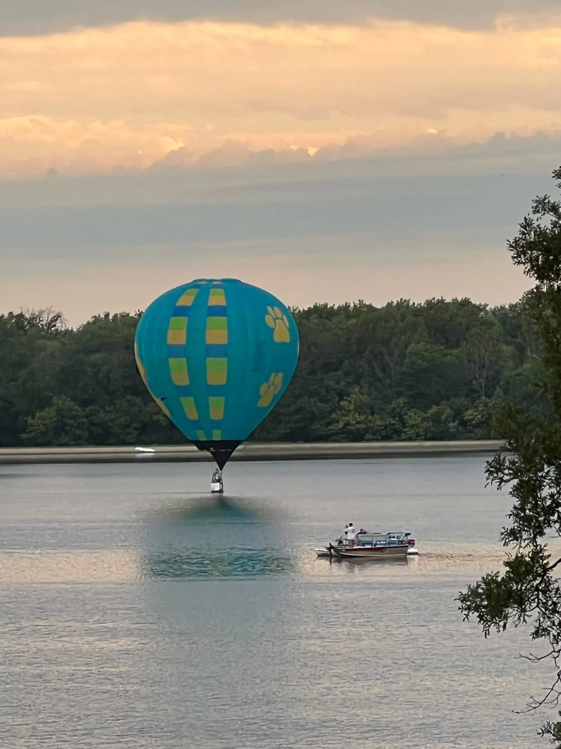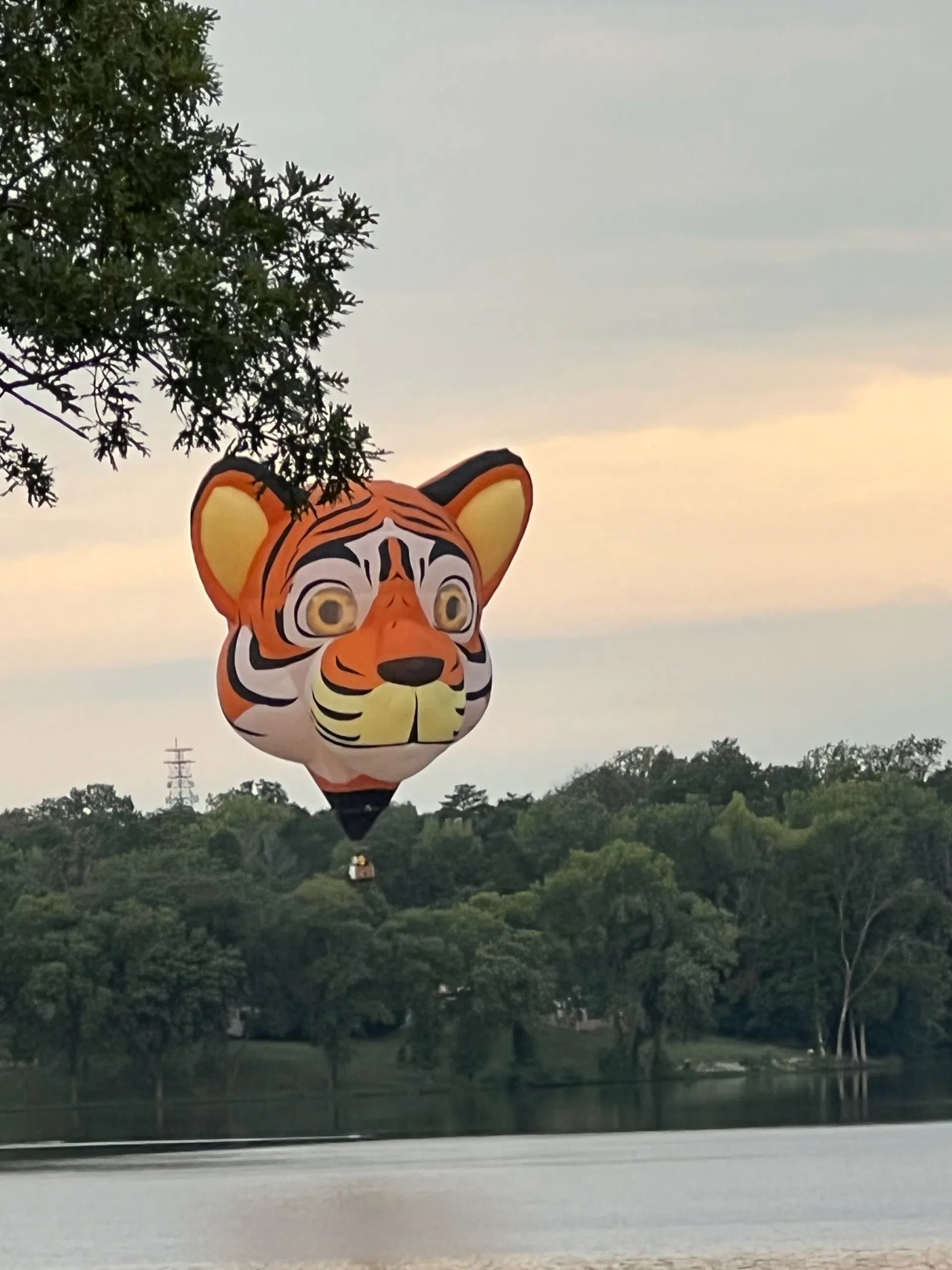 Tiger balloon gets acquainted with Raccoon Lake. Photo by Jeannel Charman.