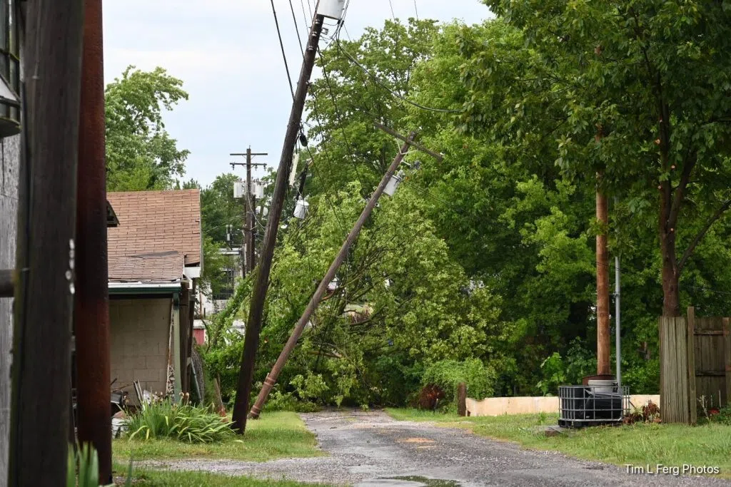 Power lines were down all over town including high transmission lines brought down in the alley in the 1400 block of North Elm in Central City by a fallen tree.