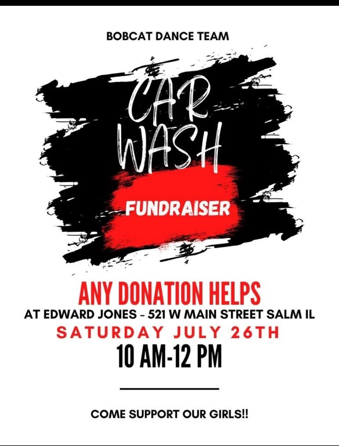 The Franklin Park Bobcat Dance Team will host a fundraising Car Wash tomorrow from 10-Noon at the Edward Jones located at 521 West Main in Salem. Come out and support the girls with any donation greatly appreciated.
