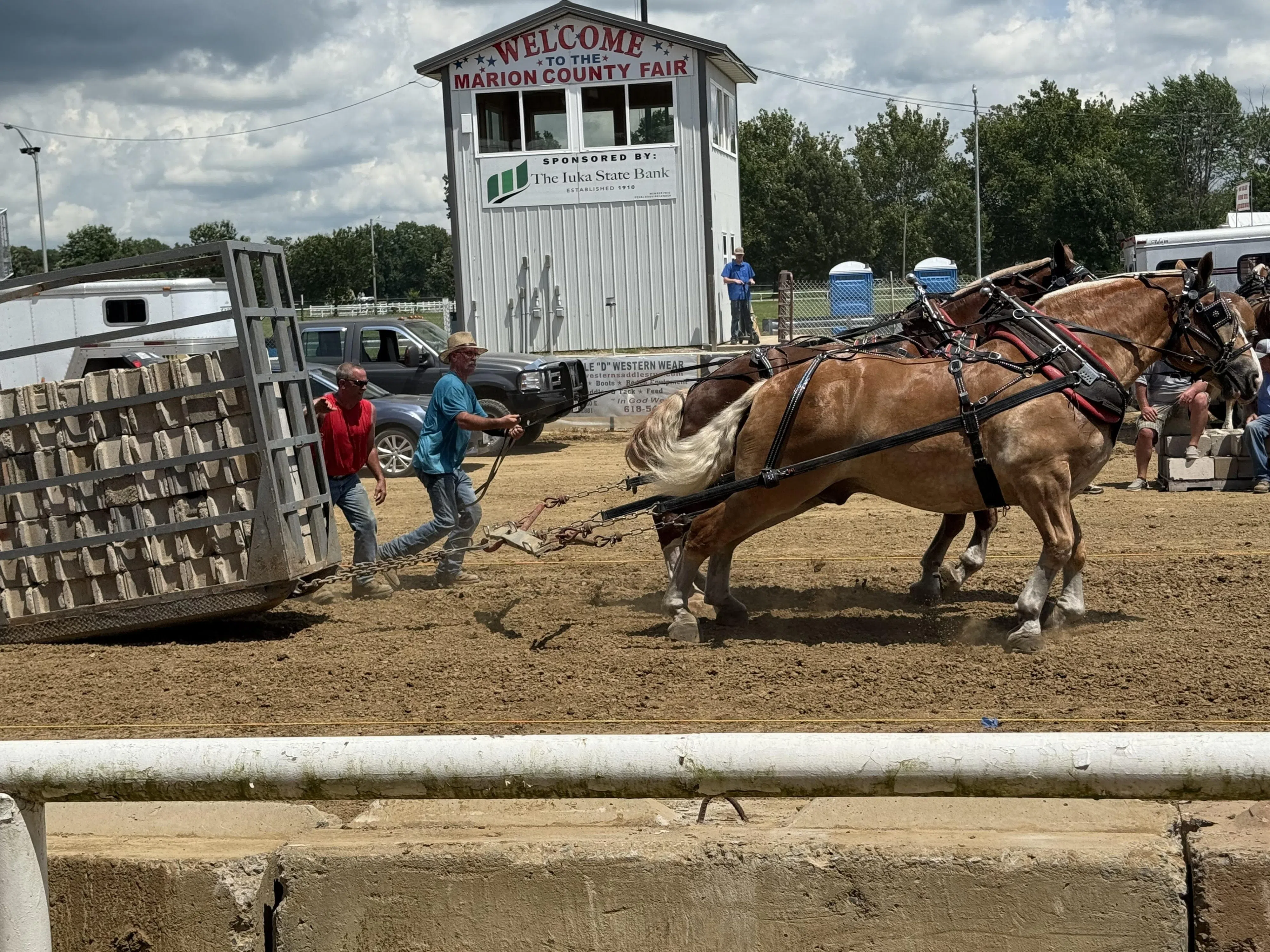 Large horses were challenged to pull a shed full of concrete blocks as far as they could at the draft horse pull held at the Marion County Fairgrounds on Sunday.