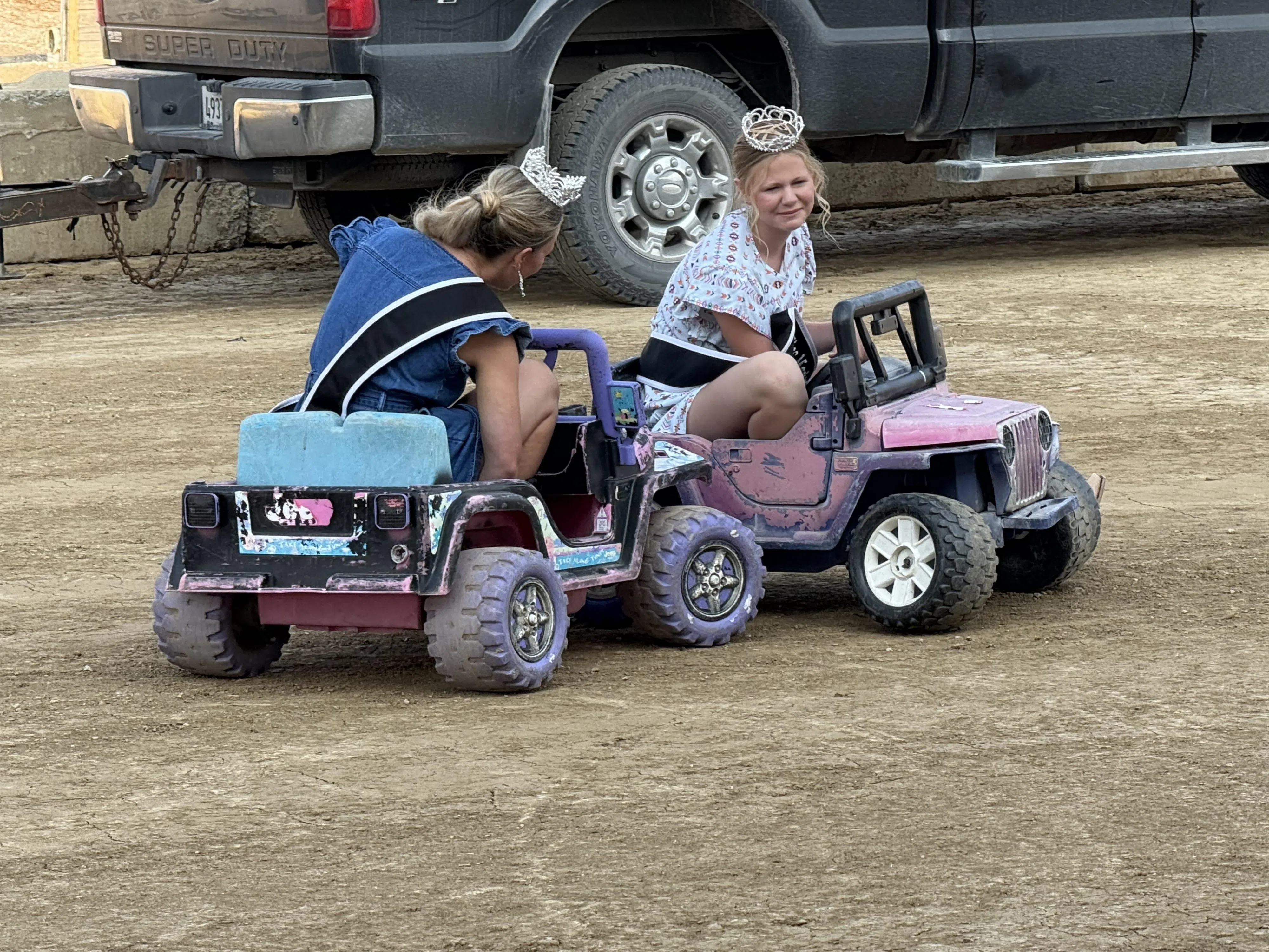Marion County Fair Queen Ella Douglas and Junior Miss Jane Taylor Rose meet up in the Power Wheels derby before Friday night’s Demolition Derby. Photo by Bruce Kropp.
