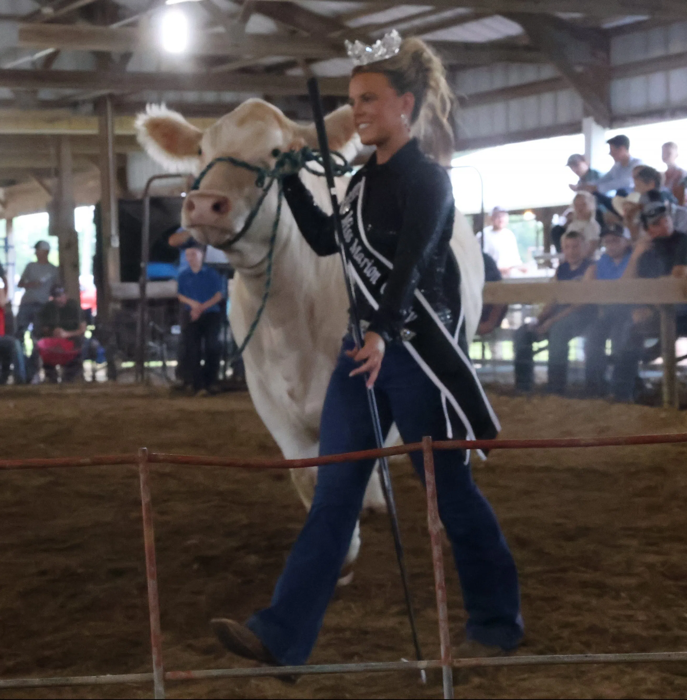 Queen Ella Douglas shows her cow at the 4H Livestock Sale on Wednesday in the Show Arena. Photo by Bruce Kropp.