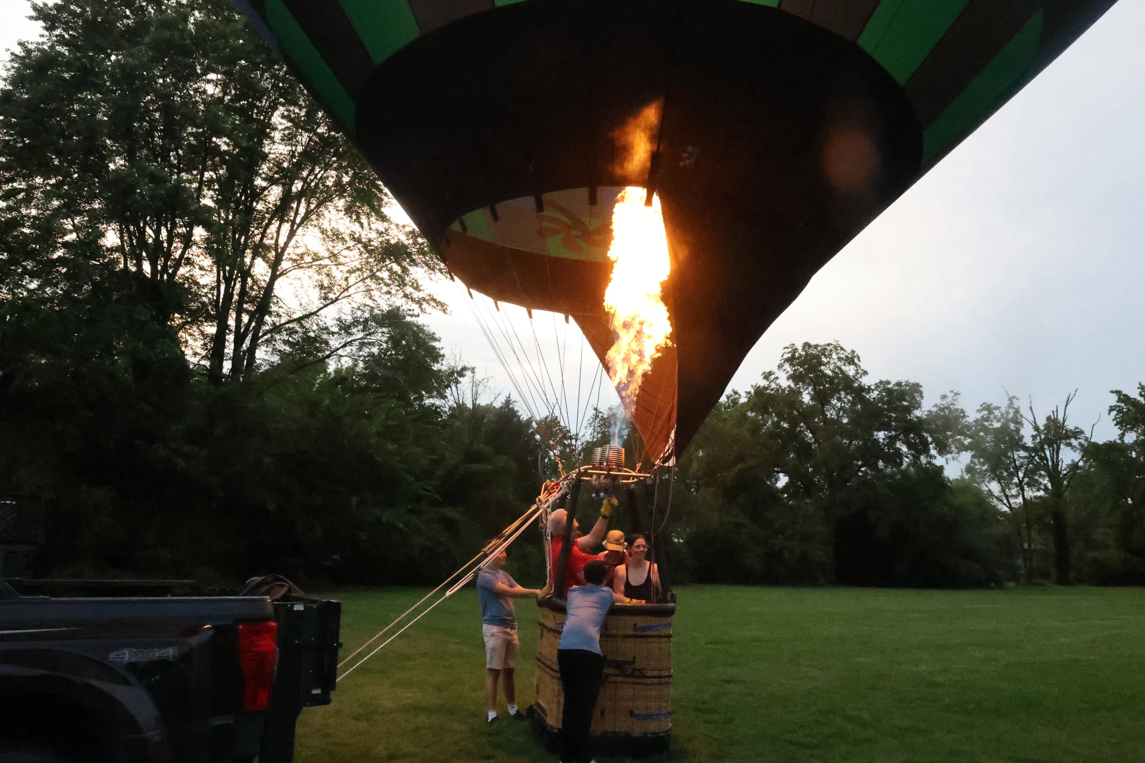 The pilot turns on his burner to keep the air hot enough to keep the balloon aloft. Photo by Bruce Kropp.