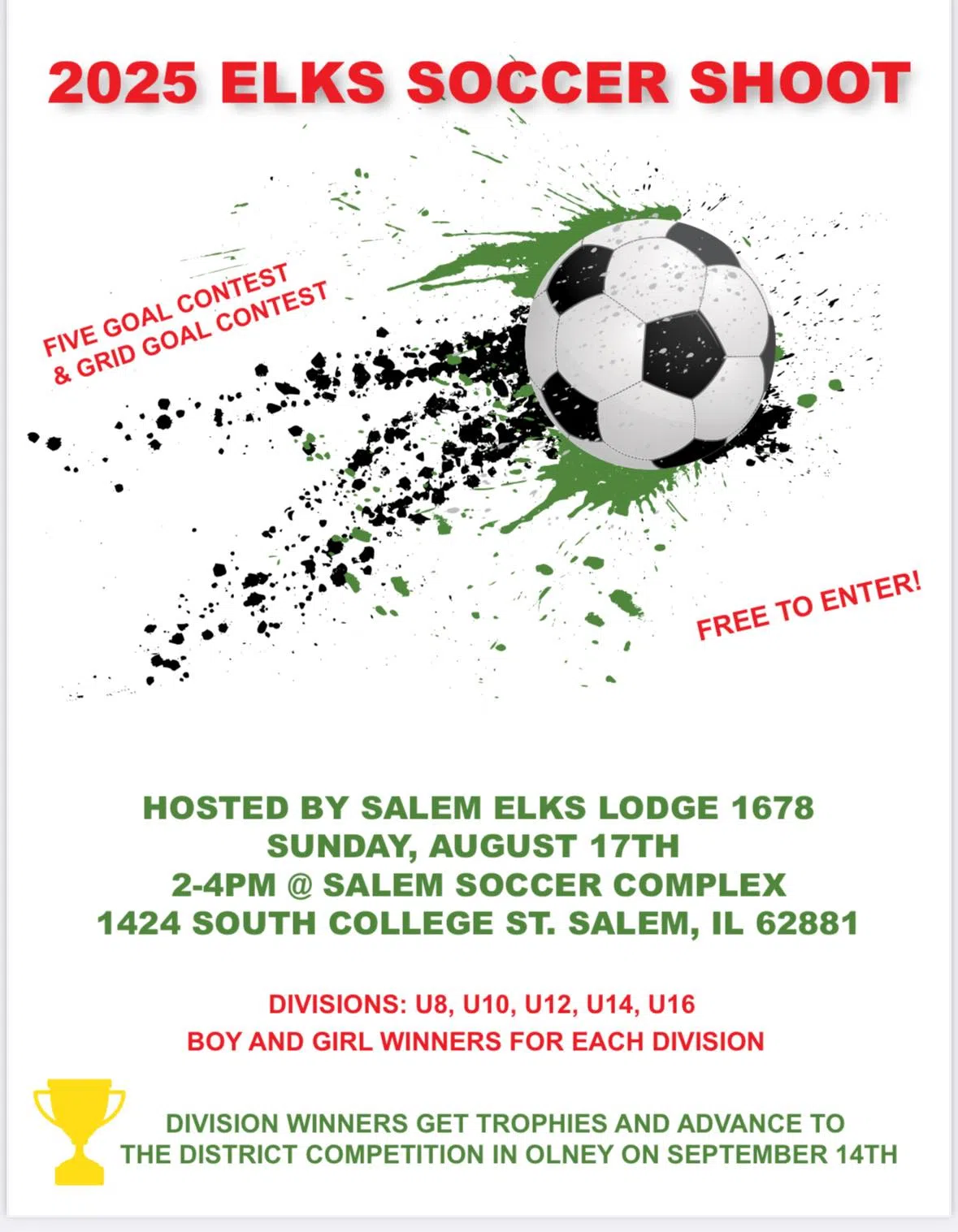 Sunday is the 2025 Elks Soccer Shoot at the Salem Soccer Complex hosted by Salem Elks Lodge 1678. Divisions are from 8-16u, boys and girls, with winners for each division will get trophies and advance to the District Competition in Olney on September 14th. It is free to enter and will be from 2-4pm.