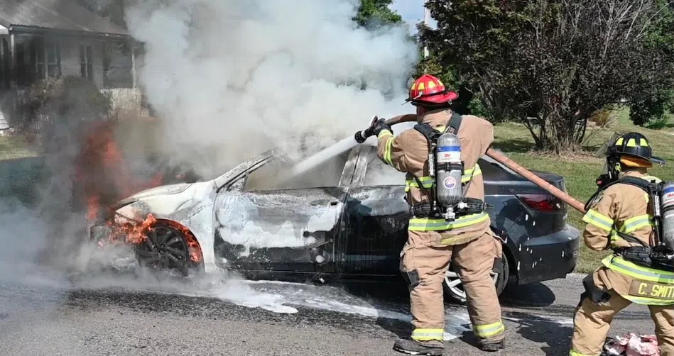 The car was fully engulfed in flames upon the arrival of the Centralia Fire Protection District. The vehicle was destroyed.