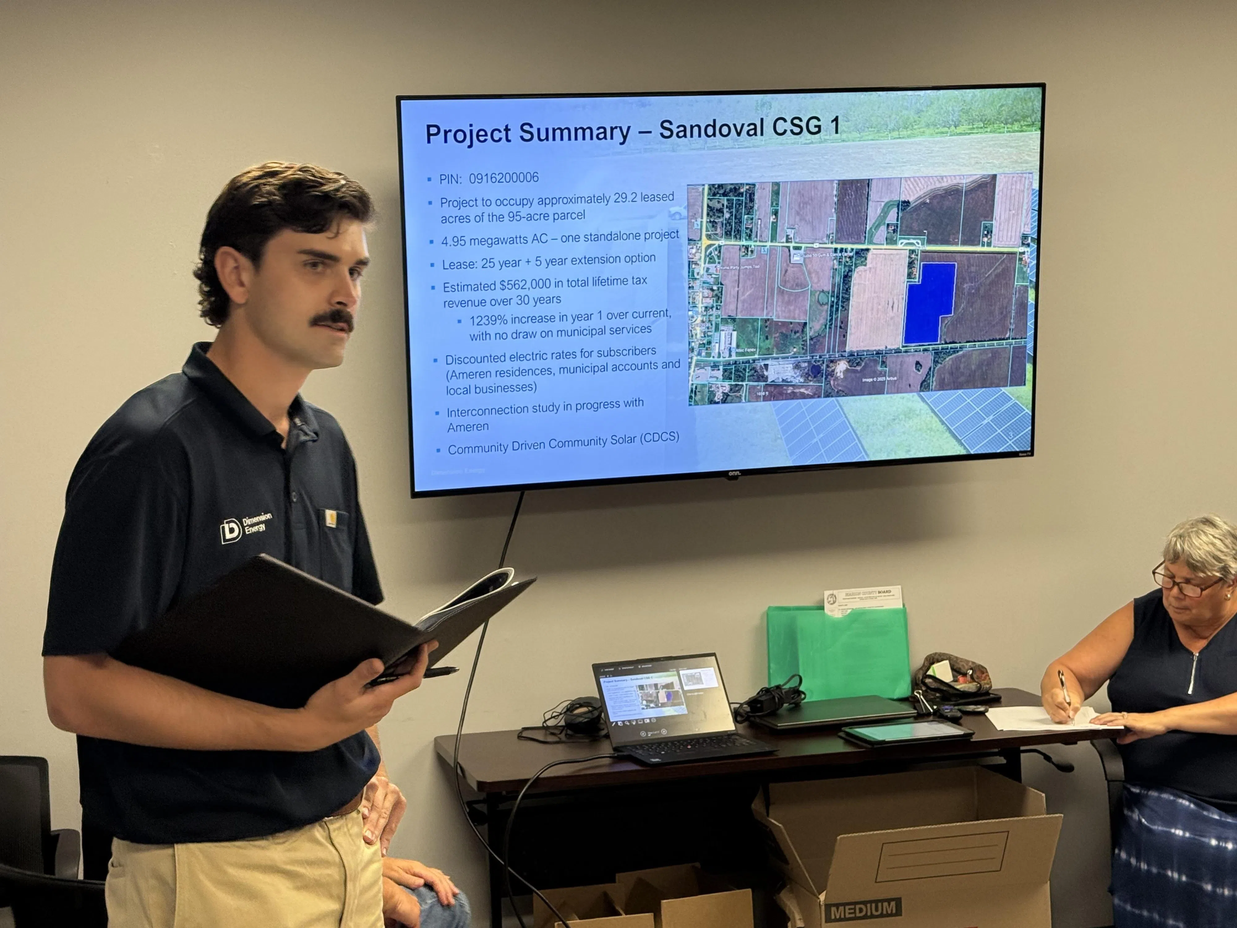The Project Development Manager for Dimension Energy Paul Irby is requesting the Marion County Board take action on the application at its August meeting so they can meet the September 1st deadline to seek state funding for the community solar project.