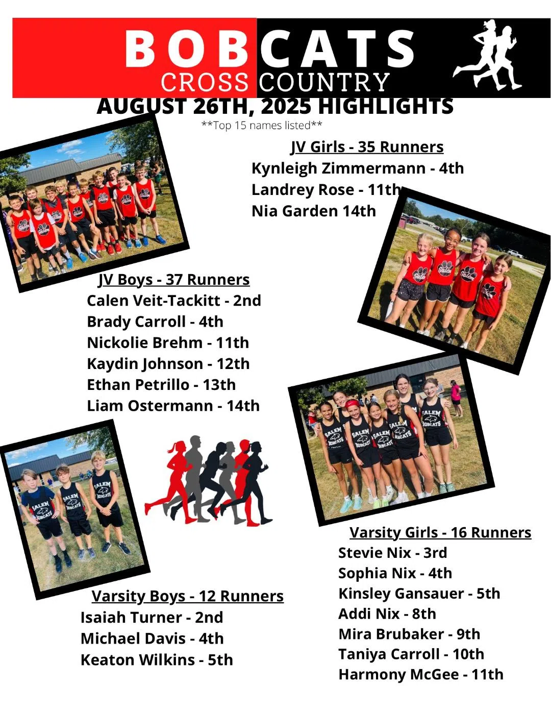 35 runners in the JV girls division with Kynleigh Zimmermann 4th and Landrey Rose 11th. The JV boys race had 37 runners with Calen Veit-Tackitt 2nd and Brady Carroll 4th.