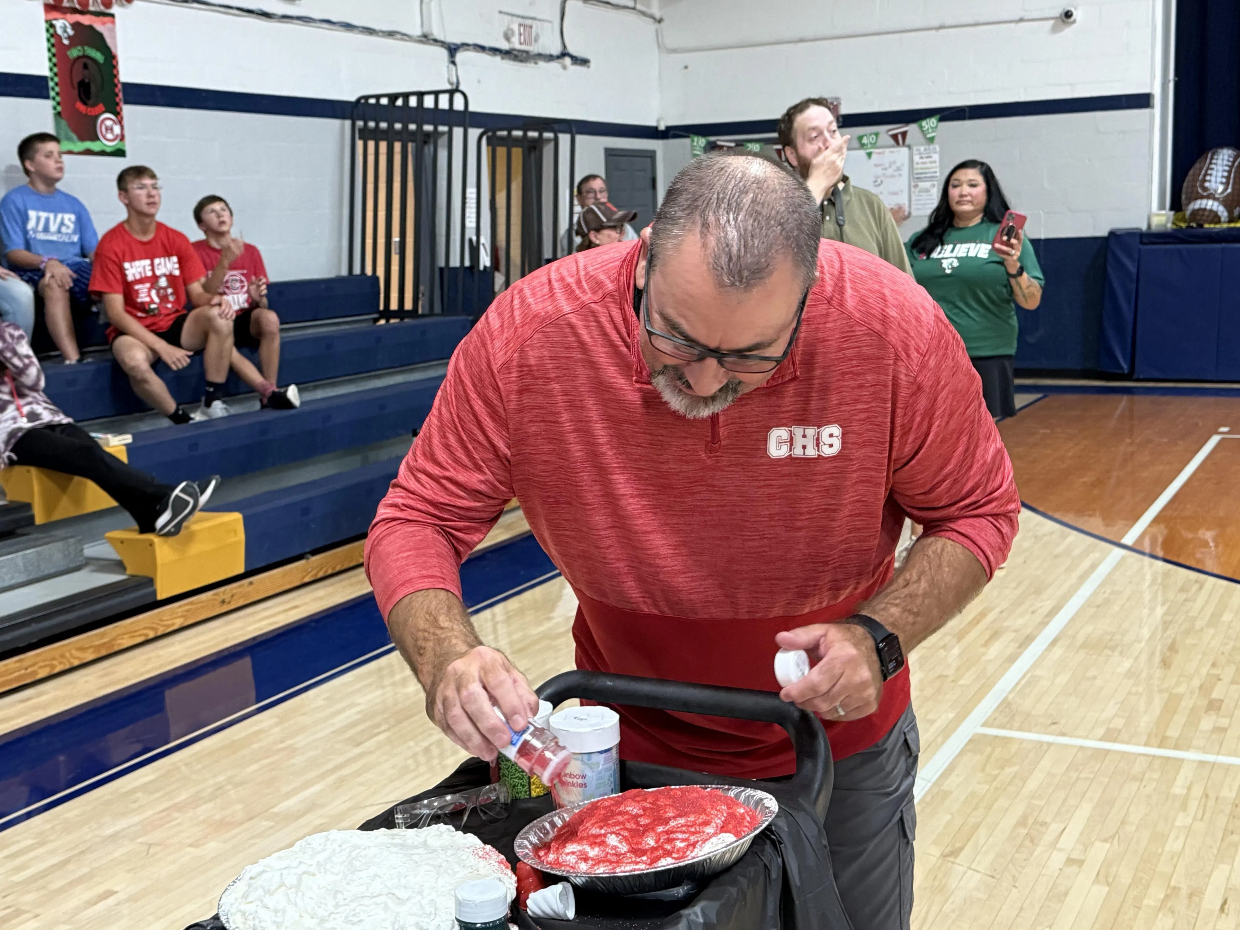 Centralia Mayor Bryan Kuder carefully adds red for the Orphans to the pie he will soon deliver to Salem Mayor Nic Farley after winning the fundraising challenge for the Shriners Hospitals. Photo by Bruce Kropp.