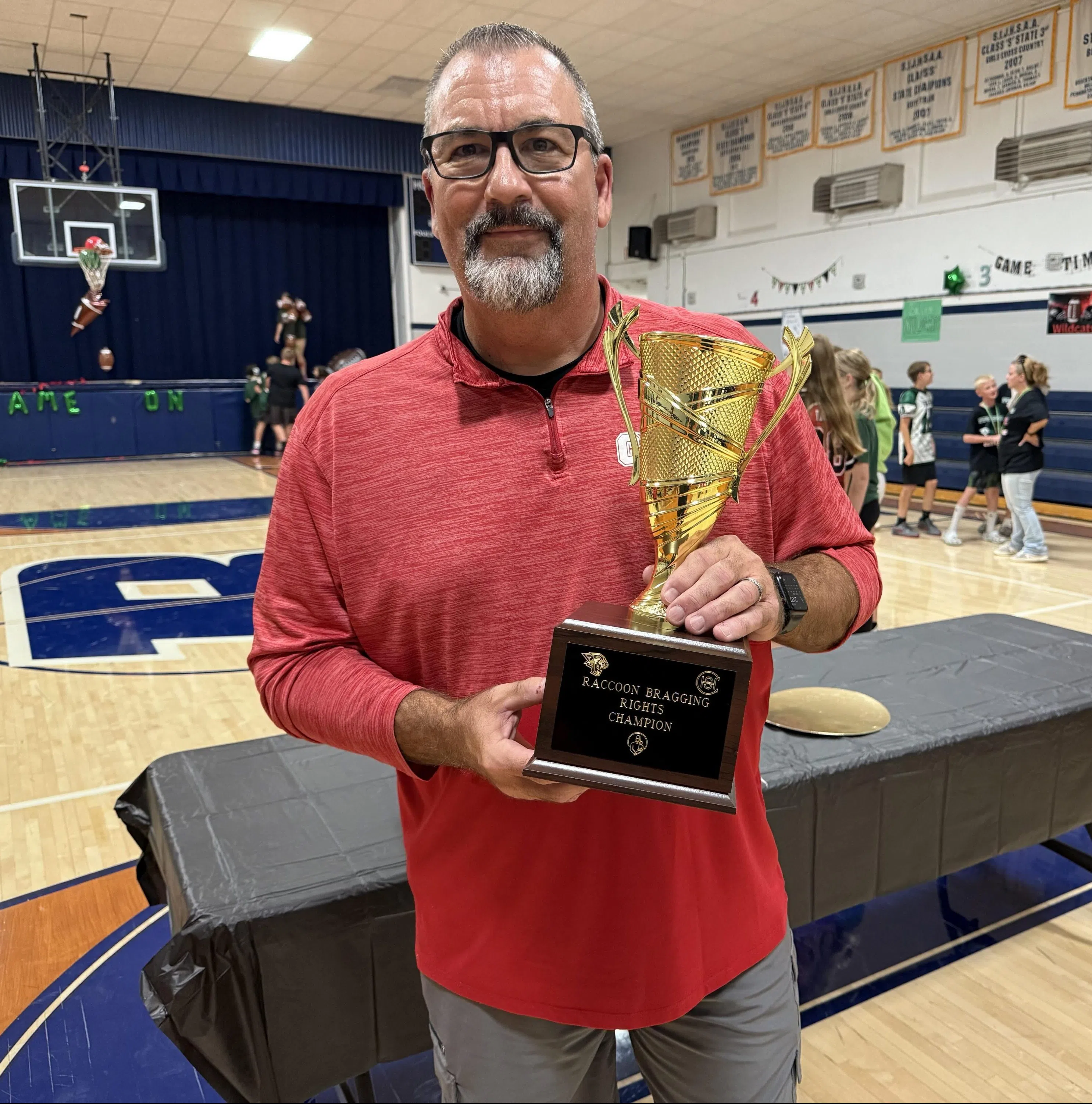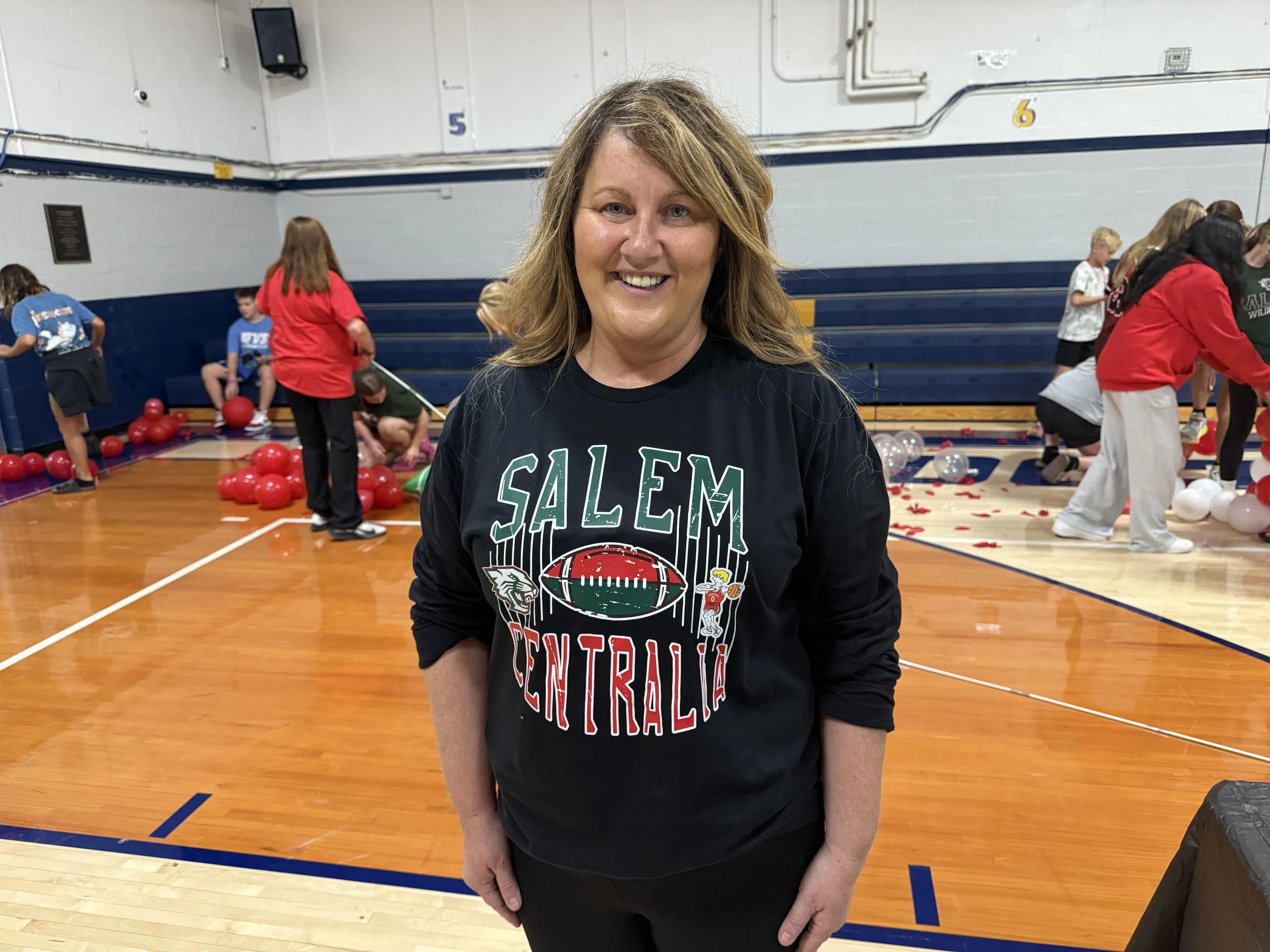 Raccoon Grade School has ties to both Salem and Centralia and stays neutral in the annual Shriner Fundraiser with a shirt featuring both teams. Photo by Bruce Kropp.