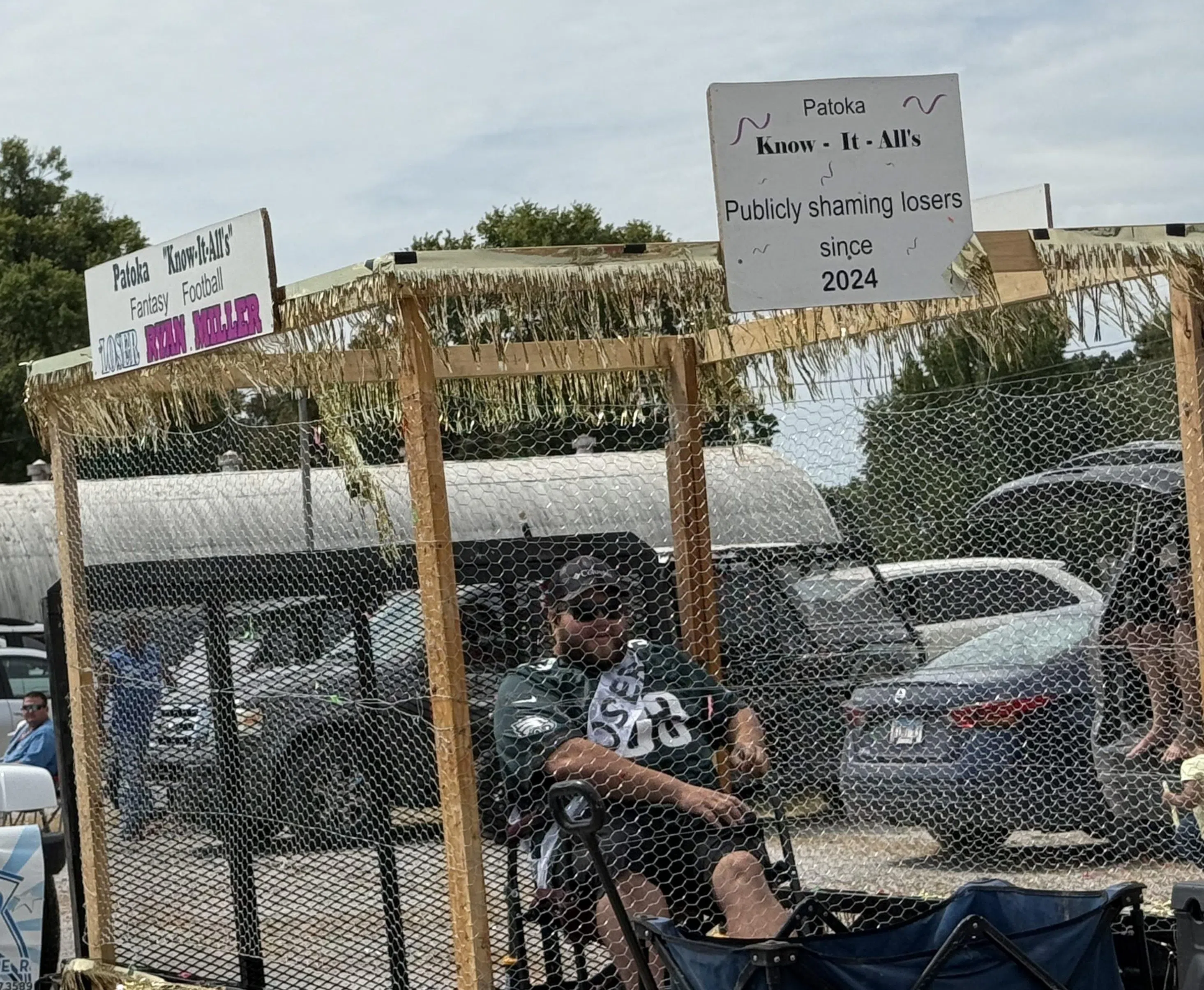 When you finish last in Fantasy Football, as Ryan Miller did, you get to sit in a float containing a jail cell and have water balloons thrown at you. Photo by Bruce Kropp.