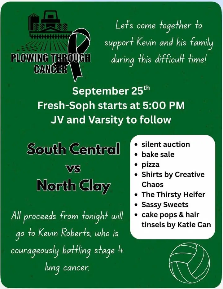 Tonight is a special night at South Central. In replacement this year of their Volley for a Cure match, they will host North Clay for a special “Plowing Through Cancer” night to help local farmer Kevin Roberts and his family as he is battling cancer. The fresh/soph match starts at 5pm. There will be a silent auction, bake sale, pizza, shirts by Creative Chaos, The Thirsty Heifer, Sassy Sweets and cake pops and hair tinsels by Katie Can.
