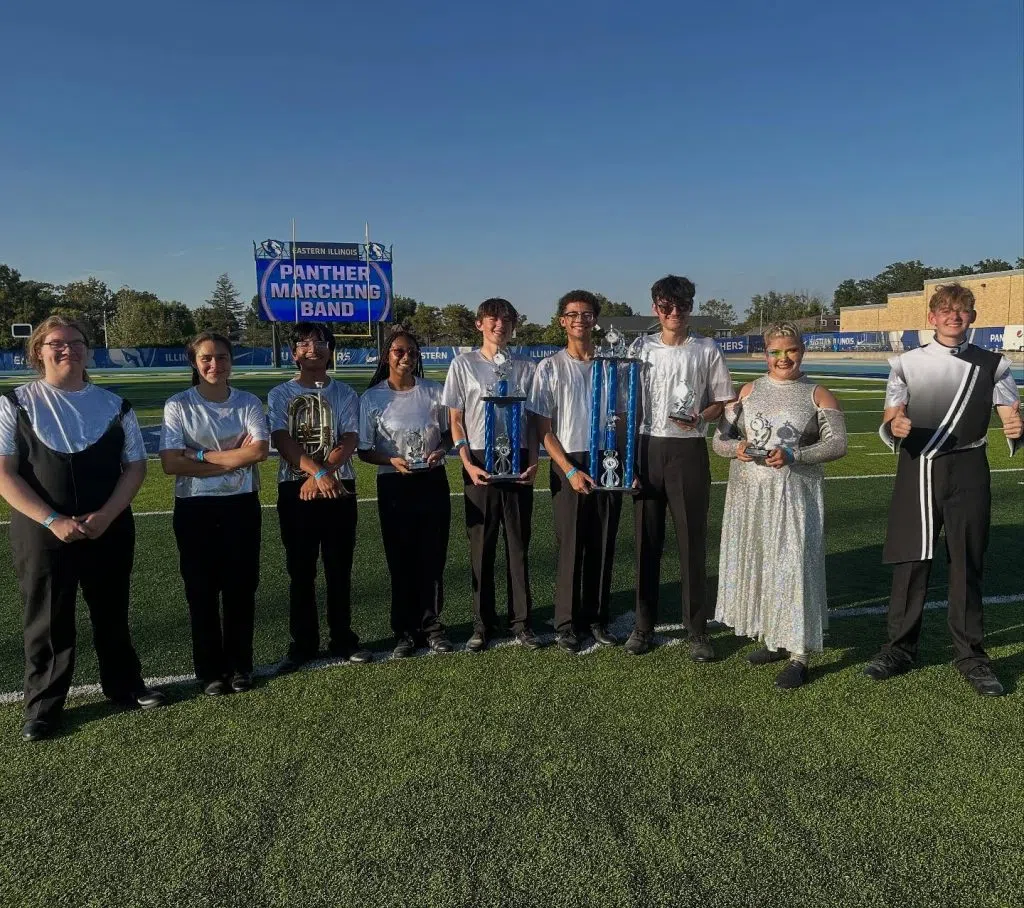 The Centralia High School Marching Showcase won every award for which they were eligible at the EIU Panther Marching Band Festival last Saturday. The band took first place overall in Open Class C, were awarded Best Color Guard, Best Percussion, Best Visual, Best Music, and Best General Effect, and were named Grand Champions of the Open Class C and D division.