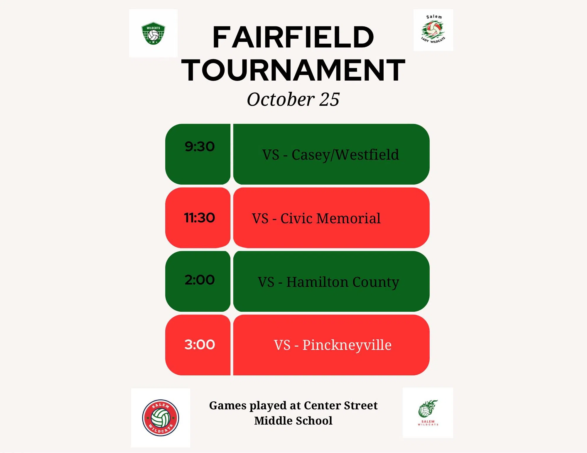 The Salem varsity volleyball team is in action today at the Fairfield Tournament. They will play Casey Westfield, Civic Memorial, Hamilton County and Pinckneyville. All games will be played at Center Street Middle School.