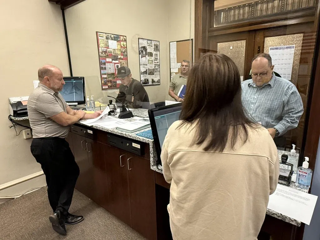 Candidates Zach Rose and Greg Wright go through the process of filing for the election with current Marion County Clerk Steve Fox. Photo by Bruce Kropp.