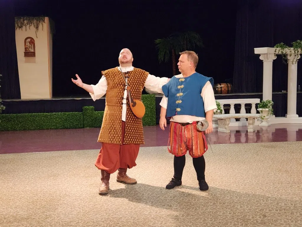 Levi Malan as Toby Belch (left) and John Bochantin as Sir Andrew (right) perform in a scene together. Photo by Austin Williams.