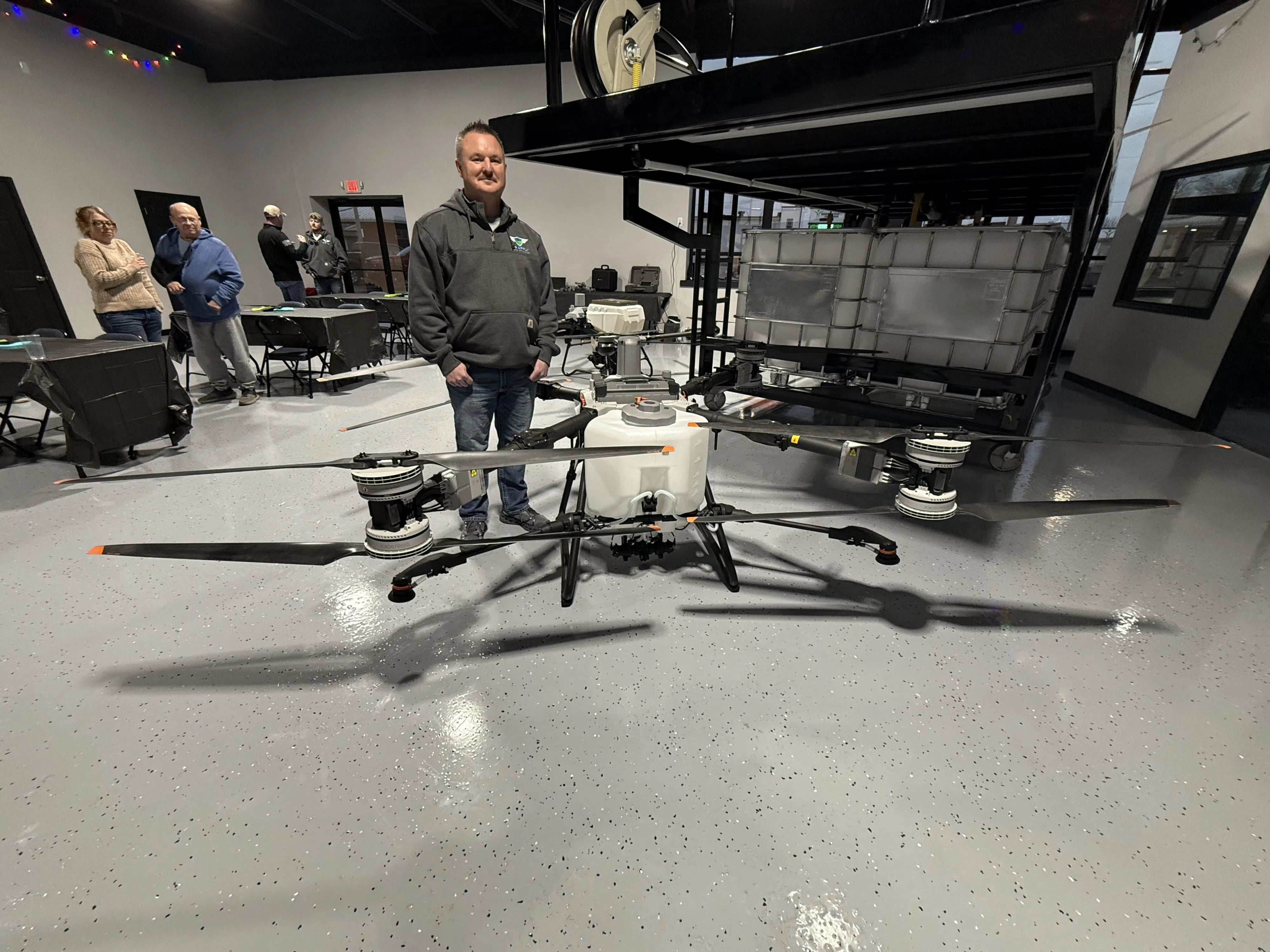 “If they want to come and check out the drones before they buy, they’re welcome to come in and check them out. We’re also going to do all of the service here. We do get a lot of the drones that have mishaps during the spray season, so they’ll be coming in for repair. We’ll be able to handle all of those repairs and support equipment as well. We’ve got truck skids that go on the back of an F550 flatbed and allow you to fill up one time a day, go out and spray all day on that fill-up, and everything you neeed is pretty much self-contained in that unit.”