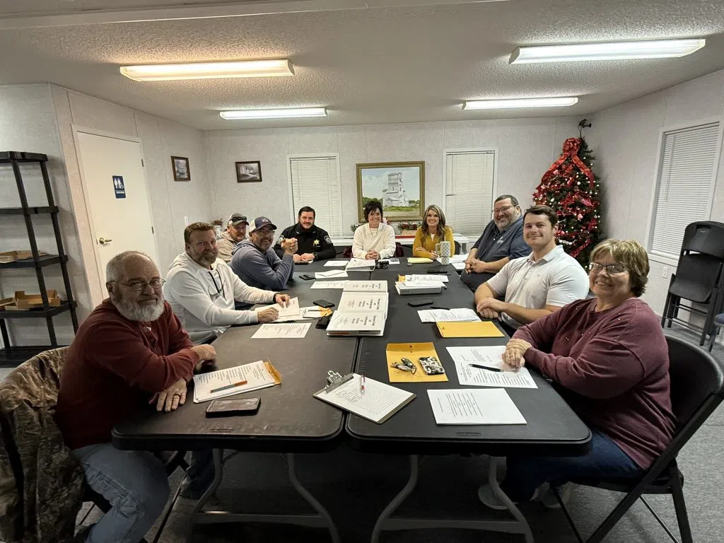 Patoka Village Board photo. Right side: Sharise McKinley, Clinton Hood, Nathan Payne, at rear Clerk Brandi Meyer, Mayor Stacy Hood, Police Chief Dylan Wolfe, and on left side: Water Superintendent Cory Hassell, and board members Stoney Sturgeon, Mark Landreth, and Lonnie Metcalf.
