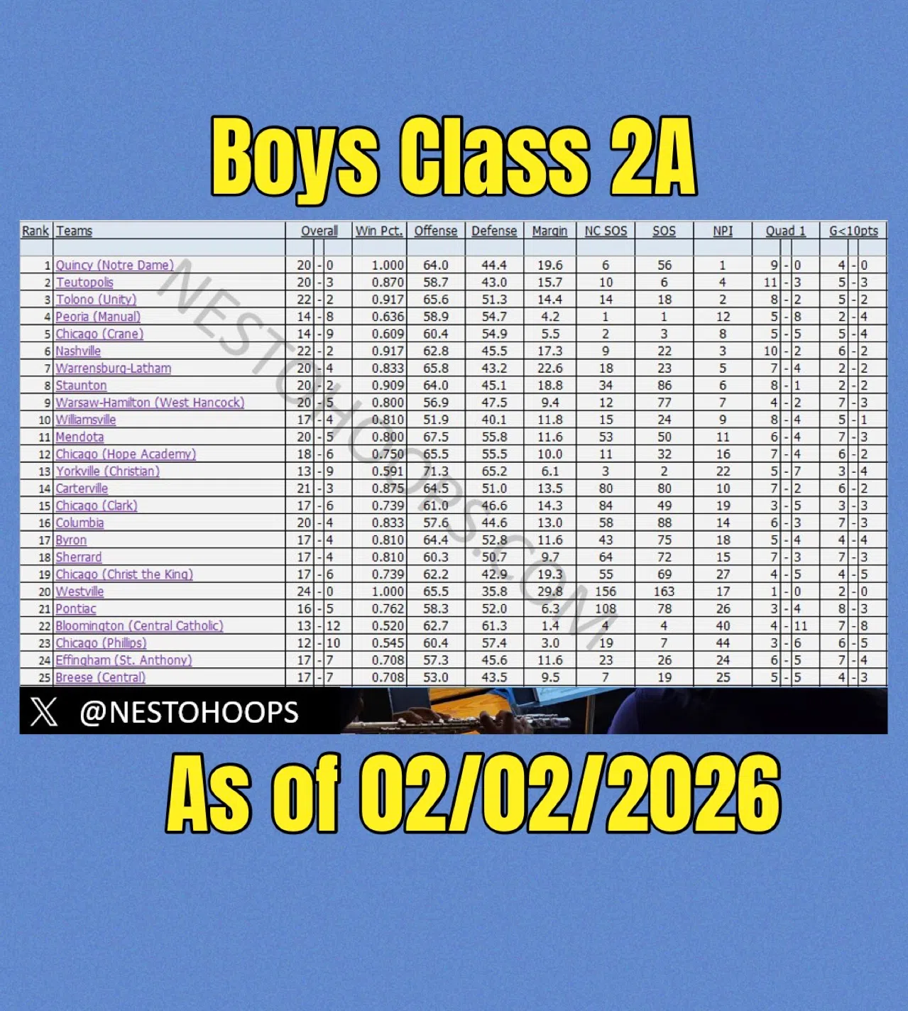 In 2a, Quincy Notre Dame is 1 with TTown right behind them at 2, Nashville is 6, Staunton 8, Carterville 14, Columbia 16, St Anthony 24 and Breese Central 25.