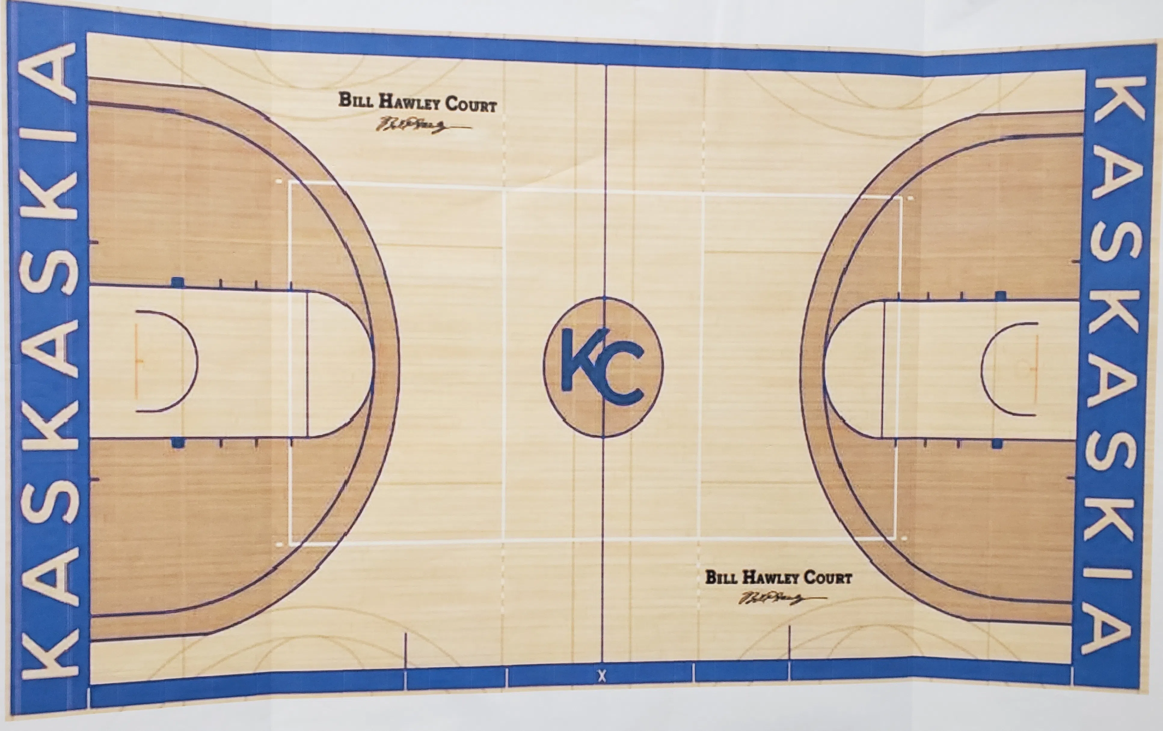Shown is a rendering of the "Bill Hawley Court" wordmark on the basketball court of the new Kaskaskia College gymnasium.
