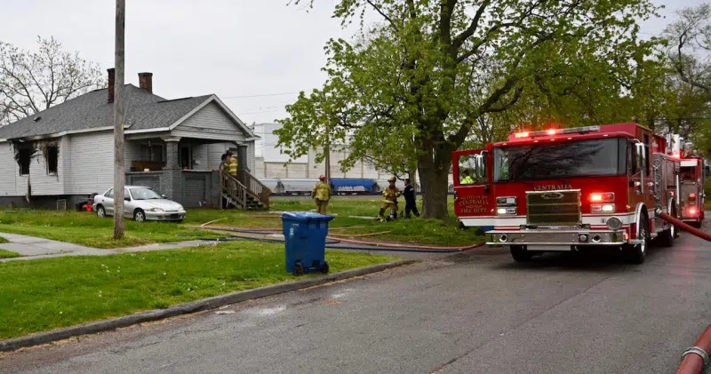 Centralia City Firemen look over the fire scene at 902 South Marion where one person received what is believed to be minor smoke inhalation from a blaze believed to have been set. Photo by Tim Ferguso...