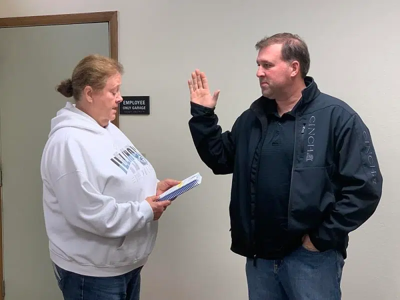 Kinmundy Mayor Jane Middleton swears in the community’s new police officer Kevin Barry at Thursday night’s meeting. Photo by Bruce Kropp. The Kinmundy Board of Alderman Thursday night was ...