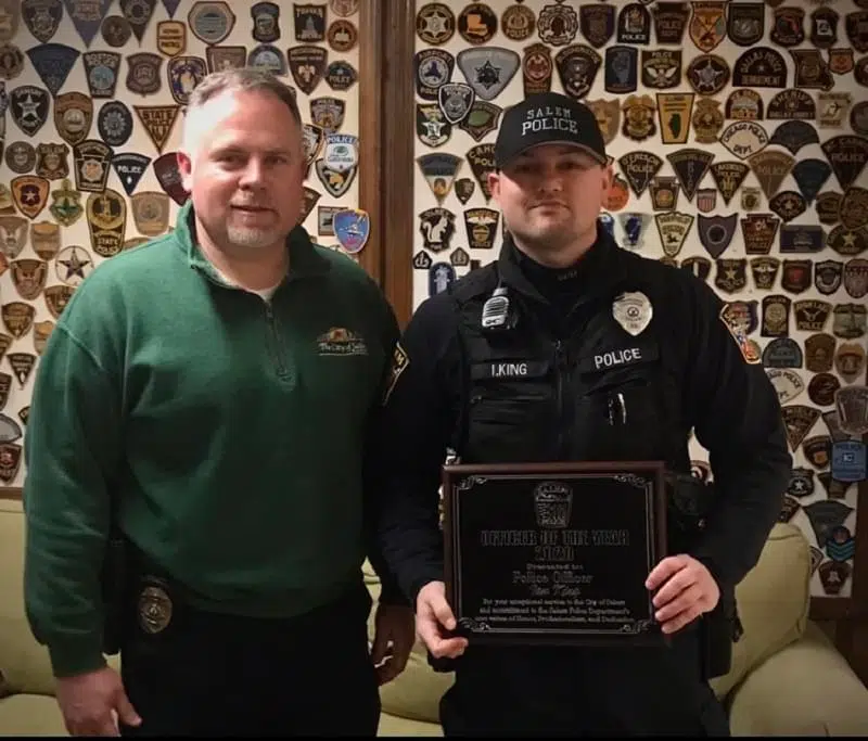 Salem Police Chief Sean Reynolds with Salem Police Officer of the Year Ian King. The Salem Police Department has named its 2020 Police Officer and Communication Officer of the Year. Patrolman Ian King...