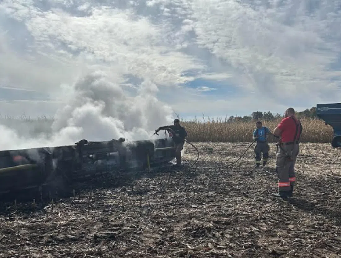 Bruce Kropp Nov 08, 2025 Odin Firemen work to keep a combine fire from spreading in a field off Hoots Chapel Road late Saturday morning.