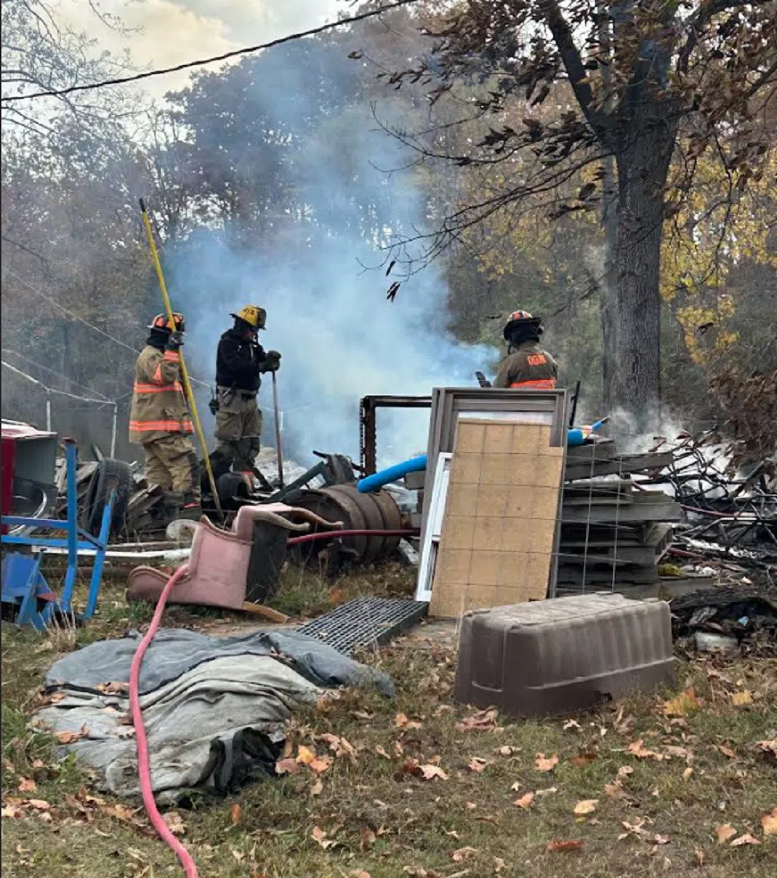 Bruce Kropp Nov 08, 2025 Odin Firemen look over Friday afternoon shed fire in Royal Lakes neighborhood.