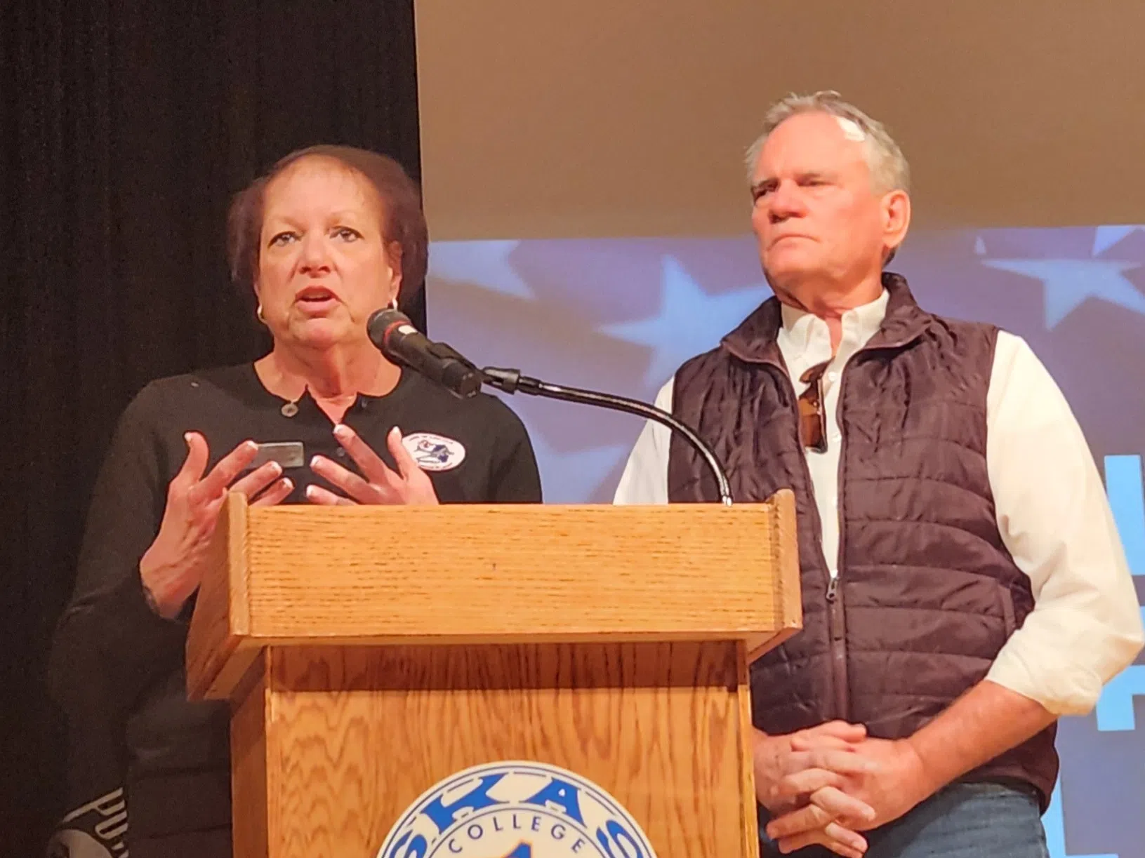 Austin Williams Nov 07, 2025 Guest speakers Joan Bortolon (left) and Steve Wheeler (right) of Land of Lincoln Honor Flight speak at this year's Enduring Freedom Celebration at Kaskaskia College. Photo by Austin Williams.