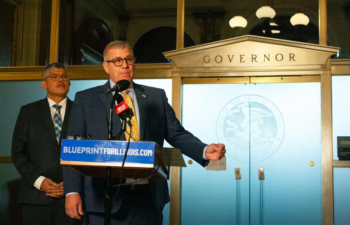 Bruce Kropp Jan 08, 2026 Republican candidate for governor Darren Bailey speaks at a news conference with running mate Aaron Del Mar on Jan. 8, 2026. (Capitol News Illinois photo by Jenna Schweikert)