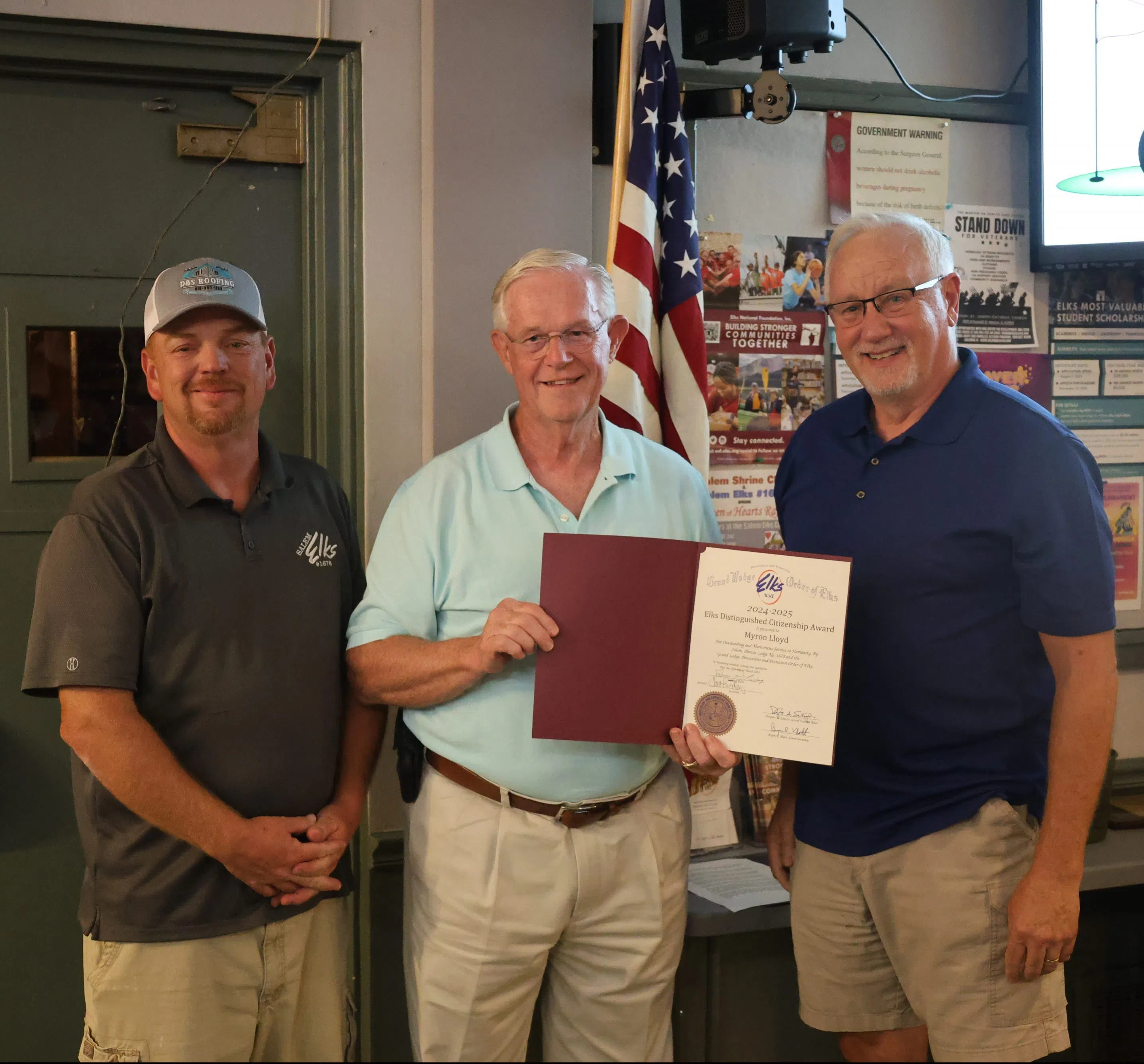 Austin Williams Sep 15, 2025 Left to right: Salem Elk's Exalted Ruler Steve Lindsey, Citizen of the Year Myron Lloyd, and Kent Geary who presented the award. Photo by Bruce Kropp.