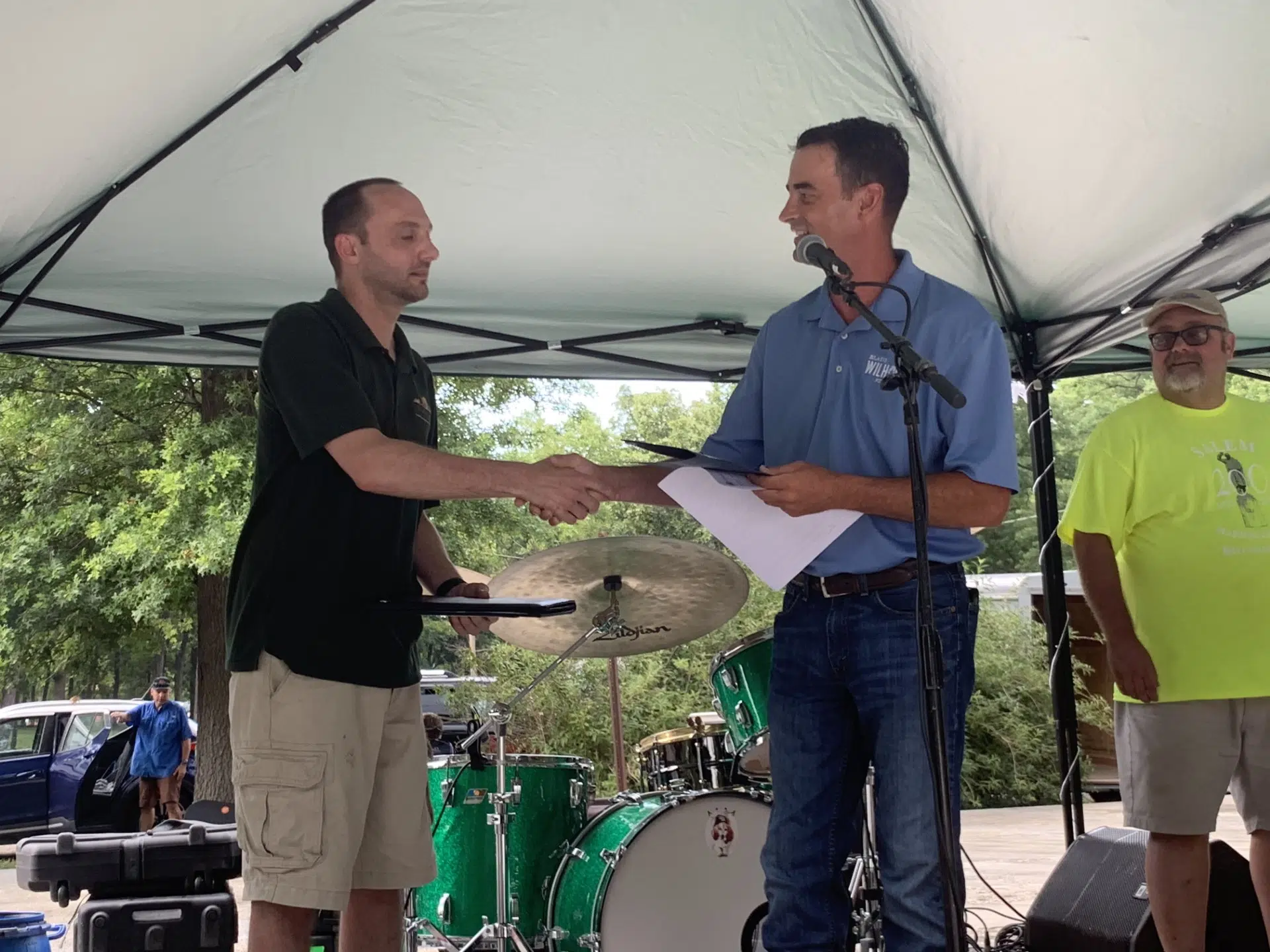 Bruce Kropp Jul 03, 2023 Salem Mayor Nic Farley (left) accepts State House Resolution marking Bicentennial from State Representative Blaine Wilhour. Photo by Bruce Kropp.