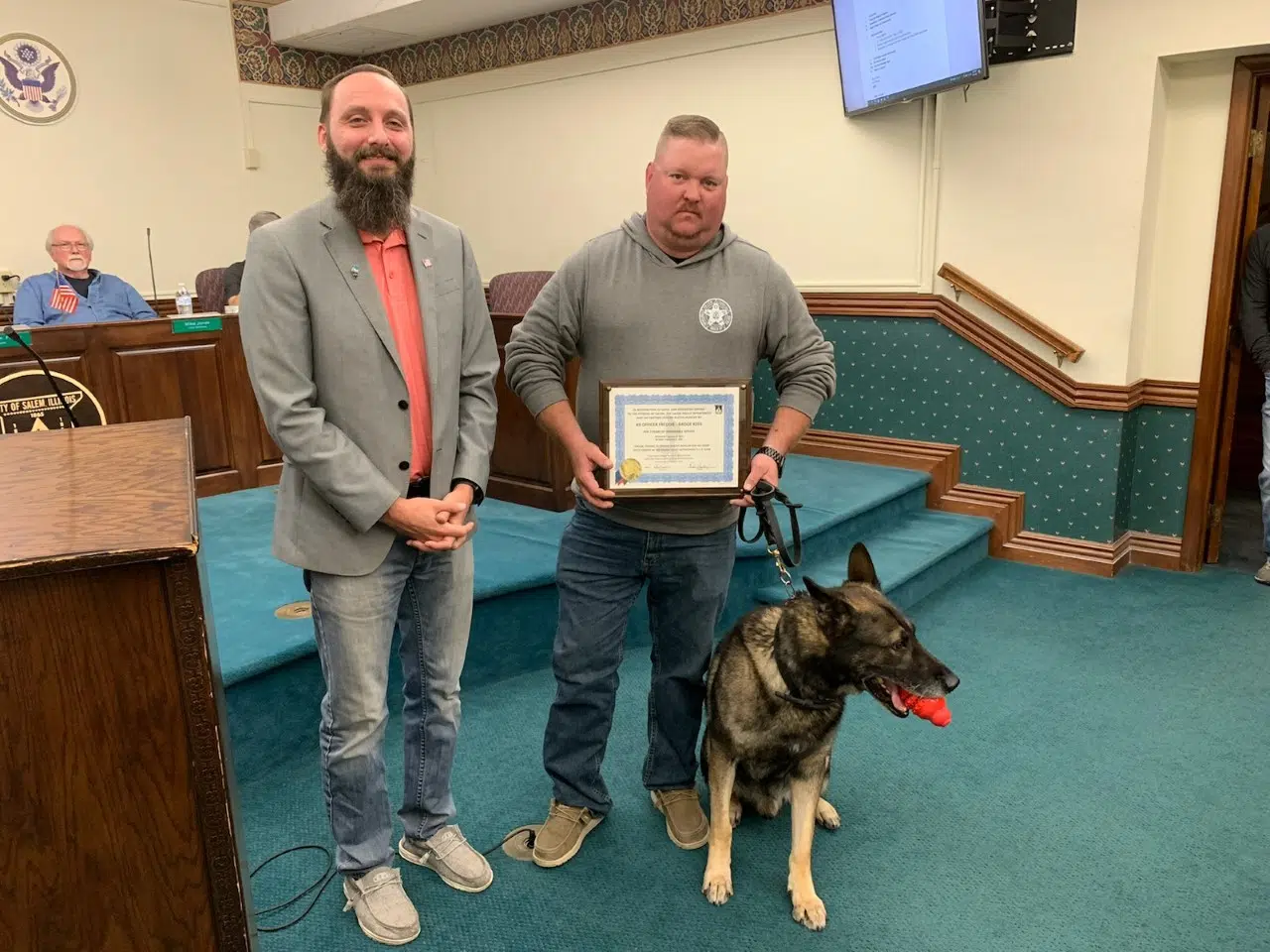 The Salem City Council Monday night honored retiring Canine Freddie and handler Dustin Duncan. Canine Freddie ended his duty on September 2nd. Mayor Nic Farley presented a plaque of appreciation. "I a...