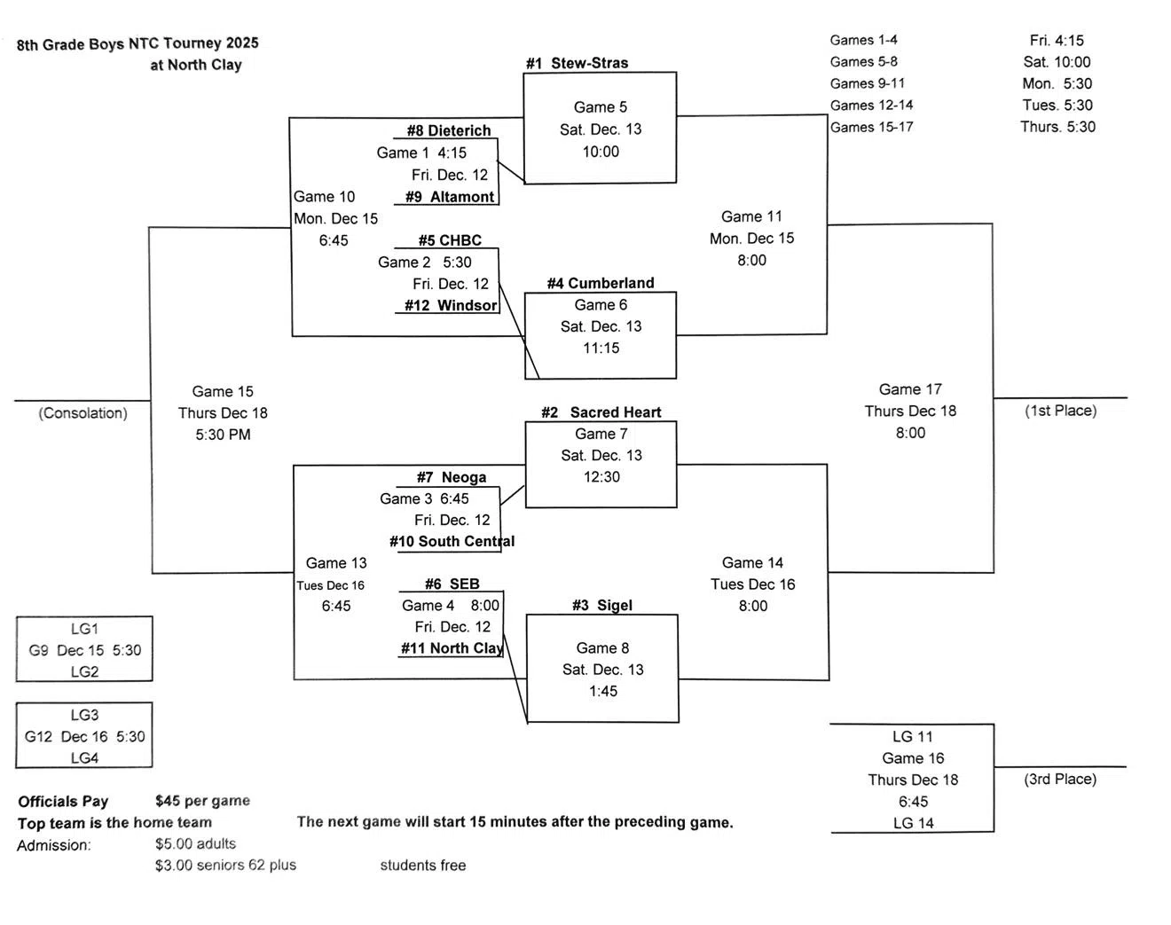 The Junior National Trail Conference Tournament opens tonight. In the 8-9 matchup, Dieterich will take on Altamont followed by CHBC and Windsor, then Neoga plays South Central and final St Elmo/Browns...
