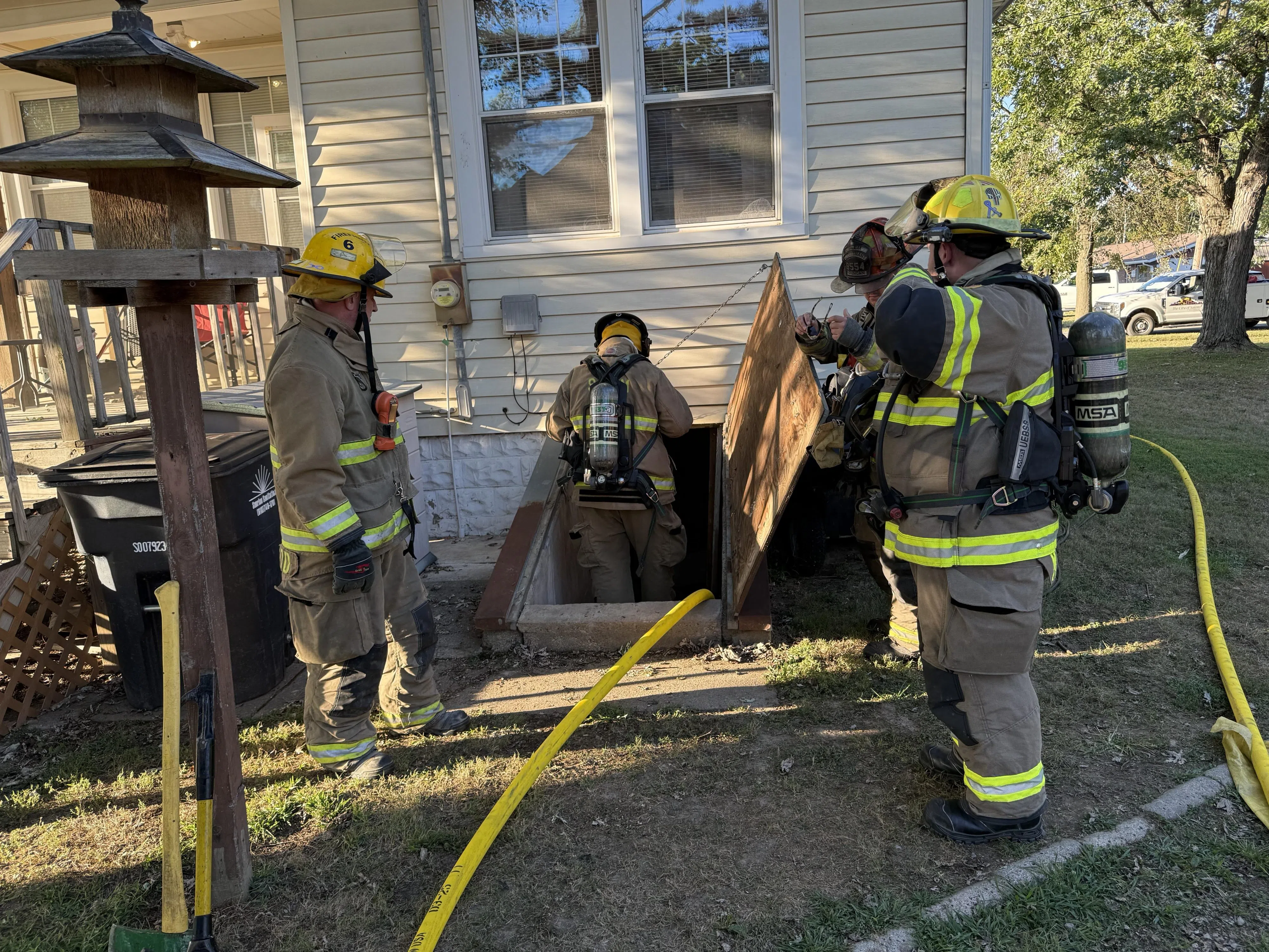 Bruce Kropp Sep 28, 2025 Firemen entering the basement at the McMackin Street fire. Photo by Bruce Kropp.