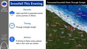 Most of the snow late Thursday and early Friday morning will stay in Central Illinois. There's another chance of snow on Saturday afternoon. Nighttime temperatures then plunge to near zero by Sunday morning. This Afternoon A 40 percent chance of snow, mainly after 5 pm. Cloudy, with a high near 36. Southwest wind around 6 mph, becoming southeast. Tonight A 50 percent chance of snow, mainly before 8 pm. Mostly cloudy, with a low around 30. Southeast wind 6 to 9 mph becoming northeast after...