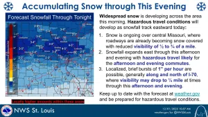 A winter weather advisory has been issued until midnight Monday night. One to three inches of snow is possible. Slippery road conditions may result. Here's the more specific forecast: This Afternoon A 50 percent chance of snow. Cloudy, with a high near 31. Calm wind. Tonight Snow, mainly before 1 am. Low around 19. Calm wind becoming northwest 5 to 8 mph after midnight. Chance of precipitation is 100%-new snow accumulation of 1 to 3 inches possible. Tuesday Partly sunny, with a high near 2...
